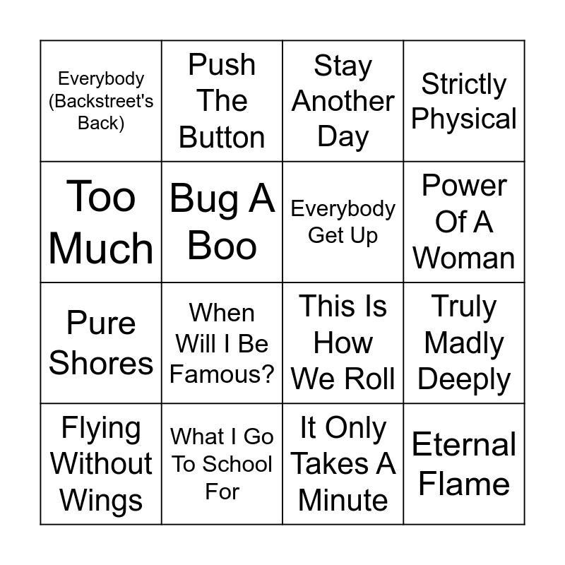 This bingo card has 30 words: I Want It That Way, End Of The End, Truly Madly Deeply, Love Me For A Reason, Everybody (Backstreet's Back), Stay Another Day, Everybody Get Up, We Will Rock You, What I Go To School For, MMMBop, It Only Takes A Minute, Flying Without Wings, Five Colours In Her Hair, Story Of My Life, When Will I Be Famous?, Sound Of The Underground, Chasing Lights, Eternal Flame, Who Do You Think You Are, Too Much, This Is How We Roll, Cannonball, Push The Button, Pure Shores, Bug A Boo, Strictly Physical, Too Gone, Too Long, Waterfalls, Power Of A Woman and Scandalous.