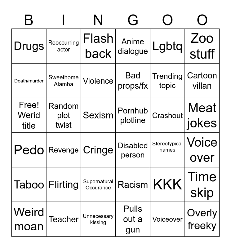 This bingo card has 36 words: Racism, Supernatural Occurance, Pulls out a gun, Death/murder, Pedo, Pornhub plotline, Sweethome Alamba, Unnecessary kissing, Lgbtq, KKK, Cartoon villan, Anime dialogue, Time skip, Random plot twist, Bad props/fx, Drugs, Taboo, Crashout, Free! Werid title, Flash back, Sexism, Revenge, Disabled person, Cringe, Stereotypical names, Reoccurring actor, Trending topic, Teacher, Violence, Zoo stuff, Overly freeky, Weird moan, Voice over, Meat jokes, Flirting and Voiceover.
