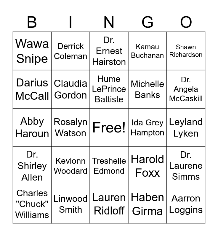 This bingo card has a free space and 60 words: Andrew Foster, Linwood Smith, Dr. Glenn Andreson, Dr. Shirley Allen, Haben Girma, Roger D. O'Kelly, Claudia Gordon, Jade Bryan, Michelle Banks, Evon Black, Kamau Buchanan, CJ Jones, Darius McCall, Joseph Sarpy, Michael Spady, Wawa Snipe, Aarron Loggins, Shawn Richardson, Antoine Hunter, Hume LePrince Battiste, Ida Grey Hampton, Dr. Ernest Hairston, Charles "Chuck" Williams, Dr. Laurene Simms, Dr. Alesia Allen, Connie Briscoe, Mary Wright, Dr. Carolyn McCaskill, Dr. Angela McCaskill, Kenny Walker, Curtis Pride, Kevin Hall, Eugene “silent” Hairston, Tamika Catchings, Derrick Coleman, Fred Beam, Willie Price, Rosalyn Watson, Roy Ricci, Abby Haroun, Mila Davis-Kent, Kevionn Woodard, Leyland Lyken, Sheena Lyles, Harold Foxx, Rosa Lee Timm, Matt Maxey, Storm Smith, Natasha Ofili, Treshelle Edmond, Lauren Ridloff, Alexandria Wailes, Angel Theory, Dr. Lindsay Dunn, Sheryl Emery, Kristi Merriweather, Tim Albert, Antonia Venesse Guy, Justina Miles and Shaheem.