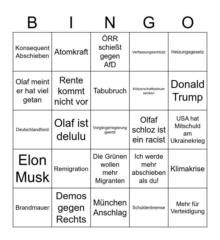 This bingo card has 25 words: Remigration, München Anschlag, Tabubruch, Brandmauer, Heizungsgesetz, Konsequent Abschieben, Olaf meint er hat viel getan, Atomkraft, Olfaf schloz ist ein racist, Die Grünen wollen mehr Migranten, Körperschaftssteuer senken, Deutschlandfond, Ich werde mehr abschieben als du!, Klimakrise, Rente kommt nicht vor, Mehr für Verteidigung, USA hat Mitschuld am Ukrainekrieg, ÖRR schießt gegen AfD, Donald Trump, Olaf ist delulu, Vorgängerregierung geerbt, Demos gegen Rechts, Elon Musk, Verfassungsschtutz and Schuldenbremse.