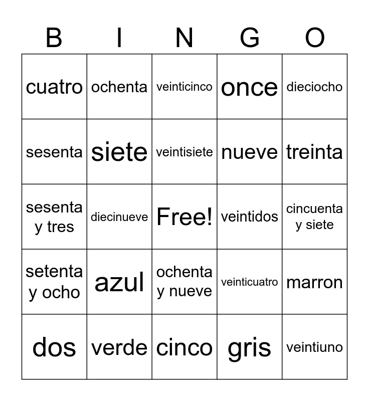 This bingo card has a free space and 56 words: uno, dos, tres, cuatro, cinco, seis, siete, ocho, nueve, diez, once, doce, trece, catorce, dieciseis, diecisiete, dieciocho, diecinueve, veinte, veintiuno, veintidos, veintitres, veinticuatro, veinticinco, veintiseis, veintisiete, veintiocho, veintinueve, treinta, treinta y dos, treinta y cuatro, cuarenta, cuarenta y cinco, cincuenta, cincuenta y siete, sesenta, sesenta y tres, setenta, setenta y ocho, ochenta, ochenta y nueve, noventa, noventa y seis, cien, rojo, azul, verde, amarillo, rosado, morado, gris, negro, blanco, naranja, marron and cafe.