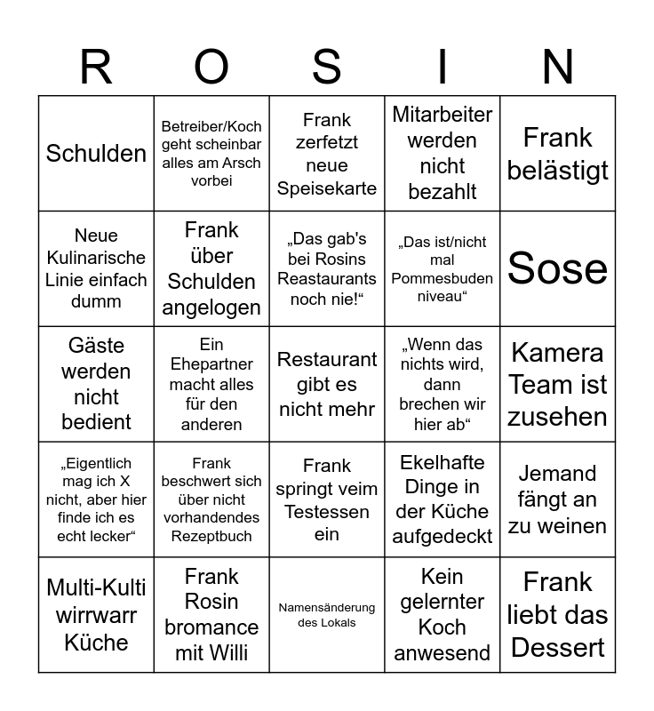 This bingo card has a free space and 31 words: Testessen unter 20 Punkten, Bei Frank krachts, „Das gab's bei Rosins Reastaurants noch nie!“, Mit Weißwein ablöschen, Frank belästigt, Schulden, Ein Ehepartner macht alles für den anderen, Namensänderung des Lokals, „Das ist/nicht mal Pommesbuden niveau“, Jemand fängt an zu weinen, „Eigentlich mag ich X nicht, aber hier finde ich es echt lecker“, Frank Rosin bromance mit Willi, Kein gelernter Koch anwesend, Frank liebt das Dessert, Gäste werden nicht bedient, Frank deckt Vorrat an convenience/TK Ware auf, Frank springt veim Testessen ein, „Wenn das nichts wird, dann brechen wir hier ab“, Kamera Team ist zusehen, Multi-Kulti wirrwarr Küche, Betreiber/Koch geht scheinbar alles am Arsch vorbei, Musik praktikant gönnt wildeste Mucke, Ekelhafte Dinge in der Küche aufgedeckt, Sose, Neue Kulinarische Linie einfach dumm, Frank über Schulden angelogen, Frank zerfetzt neue Speisekarte, Mitarbeiter werden nicht bezahlt, Familienmitglied nimmt hohen Kredit auf, Frank beschwert sich über nicht vorhandendes Rezeptbuch and Schnitzel.