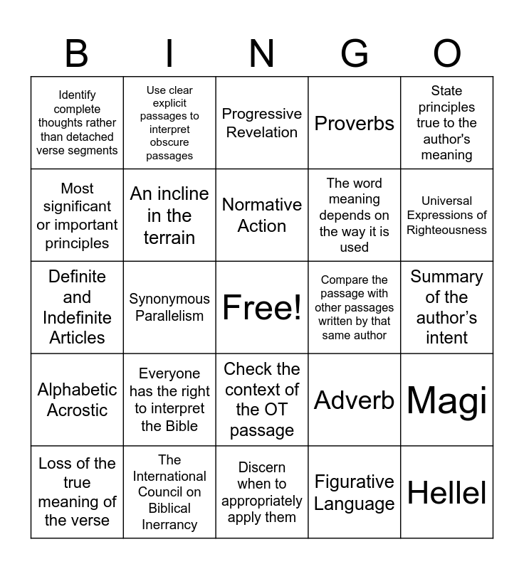 This bingo card has a free space and 24 words: Everyone has the right to interpret the Bible, The International Council on Biblical Inerrancy, Normative Action, Loss of the true meaning of the verse, State principles true to the author's meaning, Identify complete thoughts rather than detached verse segments, Most significant or important principles, Use clear explicit passages to interpret obscure passages, Compare the passage with other passages written by that same author, Check the context of the OT passage, The word meaning depends on the way it is used, Definite and Indefinite Articles, Adverb, Magi, An incline in the terrain, Figurative Language, Summary of the author’s intent, Progressive Revelation, Universal Expressions of Righteousness, Synonymous Parallelism, Hellel, Alphabetic Acrostic, Proverbs and Discern when to appropriately apply them.