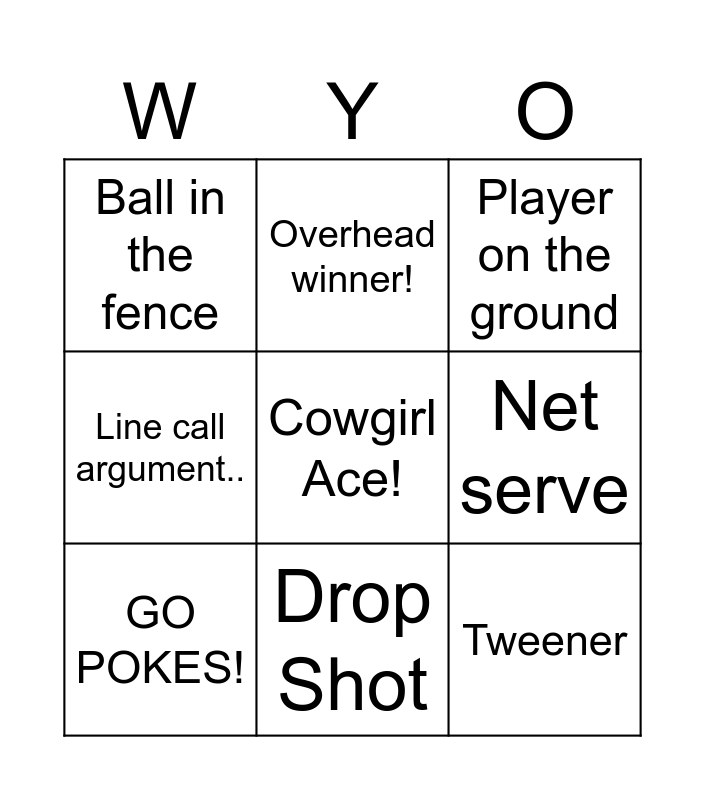 This bingo card has a free space and 8 words: Net serve, Player on the ground, Overhead winner!, GO POKES!, Ball in the fence, Tweener, Line call argument.. and Drop Shot.