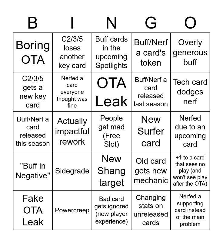 This bingo card has a free space and 24 words: Sidegrade, Powercreep, OTA Leak, Fake OTA Leak, Overly generous buff, Boring OTA, C2/3/5 gets a new key card, C2/3/5 loses another key card, New Surfer card, New Shang target, Buff/Nerf a card released last season, Buff/Nerf a card released this season, Old card gets new mechanic, +1 to a card that sees no play (and won't see play after the OTA), Nerfed a card everyone thought was fine, Changing stats on unreleased cards, Nerfed due to an upcoming card, Buff cards in the upcoming Spotlights, Tech card dodges nerf, Actually impactful rework, Nerfed a supporting card instead of the main problem, "Buff in Negative", Buff/Nerf a card's token and Bad card gets ignored (new player experience).