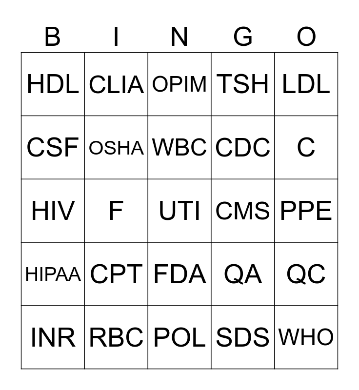 This bingo card has a free space and 24 words: CPT, RBC, WBC, INR, LDL, HDL, CSF, CLIA, CMS, FDA, CDC, HIV, QA, QC, OSHA, SDS, PPE, OPIM, C, F, WHO, HIPAA, TSH and POL.