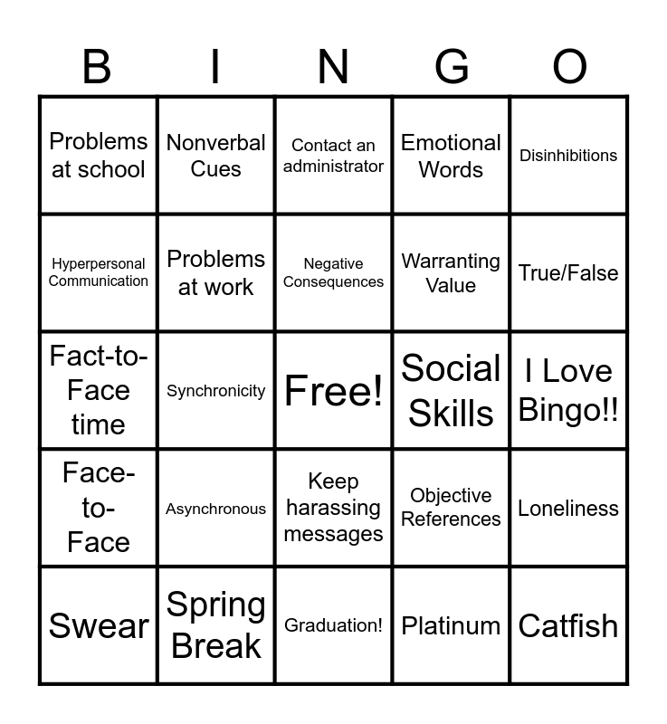 This bingo card has a free space and 24 words: Asynchronous, Spring Break, Negative Consequences, Swear, Disinhibitions, Problems at school, Hyperpersonal Communication, Nonverbal Cues, Social Skills, Keep harassing messages, Warranting Value, Fact-to-Face time, Objective References, Loneliness, Problems at work, Platinum, I Love Bingo!!, Contact an administrator, True/False, Synchronicity, Catfish, Face-to-Face, Emotional Words and Graduation!.