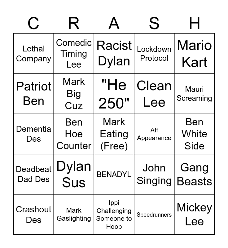 This bingo card has a free space and 24 words: Dylan Sus, Mark Gaslighting, "He 250", Crashout Des, Mario Kart, Lethal Company, Patriot Ben, Comedic Timing Lee, Aff Appearance, BENADYL, Clean Lee, Dementia Des, John Singing, Gang Beasts, Mark Big Cuz, Speedrunners, Ben White Side, Racist Dylan, Mauri Screaming, Ben Hoe Counter, Mickey Lee, Deadbeat Dad Des, Lockdown Protocol and Ippi Challenging Someone to Hoop.