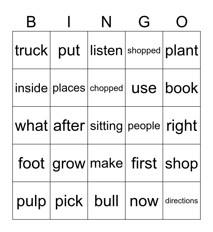 This bingo card has a free space and 24 words: grow, pick, chopped, pulp, plant, truck, inside, put, people, make, use, what, first, shop, places, now, right, listen, book, after, directions, foot, shopped and bull.