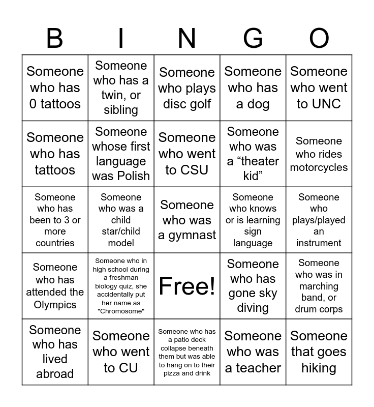 This bingo card has 26 words: Free!, Someone who was a teacher, Someone who went to CSU, Someone who went to CU, Someone who went to UNC, Someone who has 0 tattoos, Someone who has tattoos, Someone who has a twin, or sibling, Someone who plays/played an instrument, Someone who has gone sky diving, Someone who was a “theater kid”, Someone who has been to 3 or more countries, Someone who was in marching band, or drum corps, Someone who has lived abroad, Someone who was a child star/child model, Someone who has cats, Someone who has a dog, Someone who has attended the Olympics, Someone who plays disc golf, Someone who was a gymnast, Someone who rides motorcycles, Someone who has a patio deck collapse beneath them but was able to hang on to their pizza and drink, Someone who knows or is learning sign language, Someone who in high school during a freshman biology quiz, she accidentally put her name as "Chromosome", Someone whose first language was Polish and Someone that goes hiking.