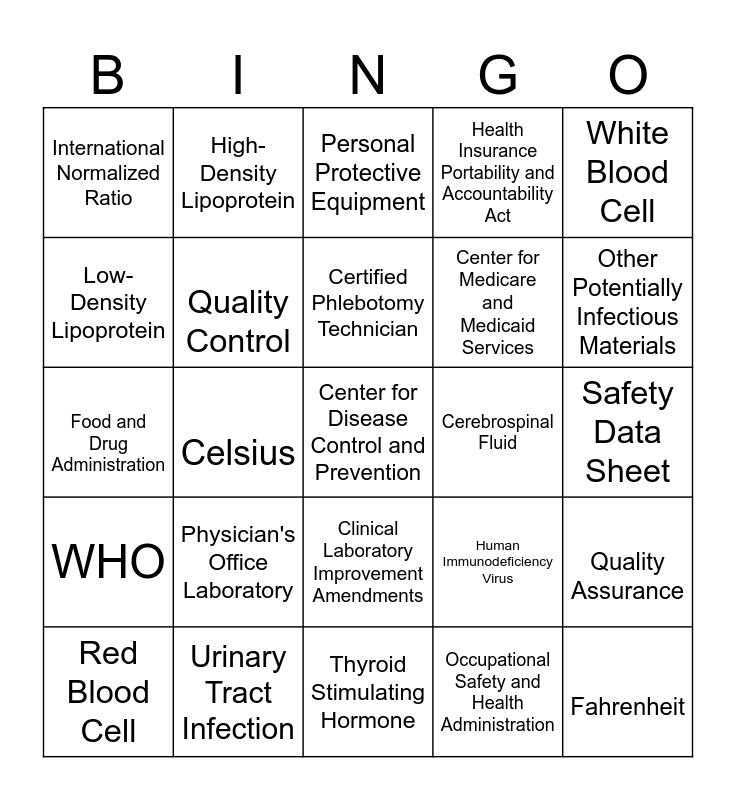This bingo card has a free space and 24 words: Physician's Office Laboratory, Urinary Tract Infection, Certified Phlebotomy Technician, Red Blood Cell, White Blood Cell, International Normalized Ratio, Low-Density Lipoprotein, High-Density Lipoprotein, Cerebrospinal Fluid, Clinical Laboratory Improvement Amendments, Center for Medicare and Medicaid Services, Food and Drug Administration, Human Immunodeficiency Virus, Quality Assurance, Quality Control, Occupational Safety and Health Administration, Safety Data Sheet, Personal Protective Equipment, Other Potentially Infectious Materials, Celsius, Fahrenheit, WHO, Health Insurance Portability and Accountability Act and Thyroid Stimulating Hormone.