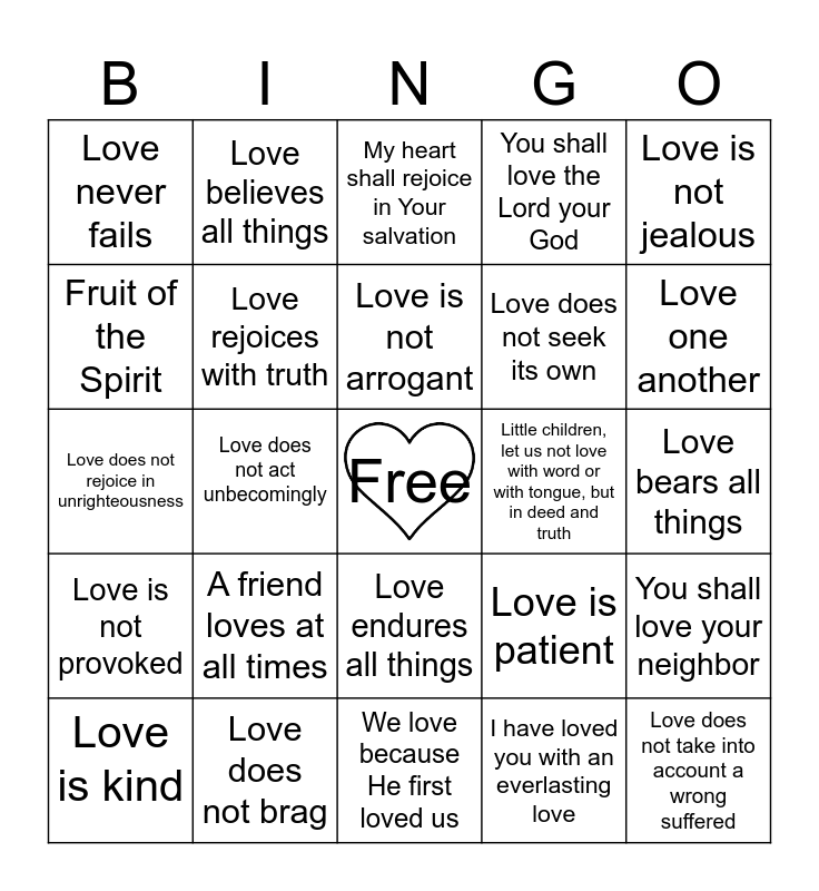 This bingo card has a free space and 24 words: Love is kind, A friend loves at all times, Love is not arrogant, I have loved you with an everlasting love, Love is not jealous, Love never fails, Love believes all things, My heart shall rejoice in Your salvation, Little children, let us not love with word or with tongue, but in deed and truth, Love bears all things, Love does not rejoice in unrighteousness, Love rejoices with truth, Love is patient, You shall love your neighbor, Fruit of the Spirit, Love does not brag, We love because He first loved us, You shall love the Lord your God, Love one another, Love is not provoked, Love does not act unbecomingly, Love endures all things, Love does not seek its own and Love does not take into account a wrong suffered.