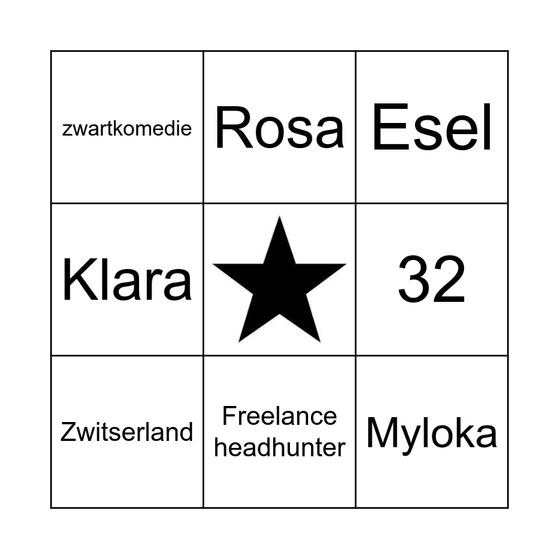 This bingo card has a free space and 10 words: Freelance headhunter, Esel, zwartkomedie, Myloka, Klara, Zwitserland, Rosa, Reiner, 32 and Tomer.