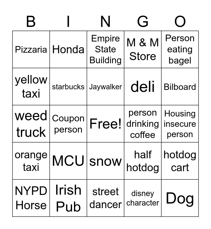 This bingo card has a free space and 24 words: MCU, Irish Pub, Jaywalker, NYPD Horse, Person eating bagel, Pizzaria, yellow taxi, Honda, person drinking coffee, snow, deli, weed truck, half hotdog, hotdog cart, starbucks, disney character, Housing insecure person, Empire State Building, Bilboard, Coupon person, Dog, orange taxi, M & M Store and street dancer.