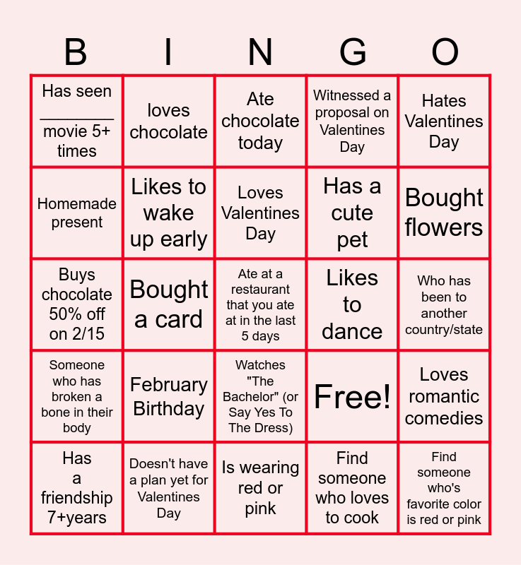 This bingo card has 25 words: February Birthday, Is wearing red or pink, Loves Valentines Day, Has a friendship 7+years, Hates Valentines Day, Has seen ________ movie 5+ times, Homemade present, loves chocolate, Likes to dance, Watches "The Bachelor" (or Say Yes To The Dress), Has a cute pet, Buys chocolate 50% off on 2/15, Free!, Loves romantic comedies, Likes to wake up early, Find someone who's favorite color is red or pink, Who has been to another country/state, Ate chocolate today, Bought flowers, Bought a card, Ate at a restaurant that you ate at in the last 5 days, Doesn't have a plan yet for Valentines Day, Someone who has broken a bone in their body, Witnessed a proposal on Valentines Day and Find someone who loves to cook.
