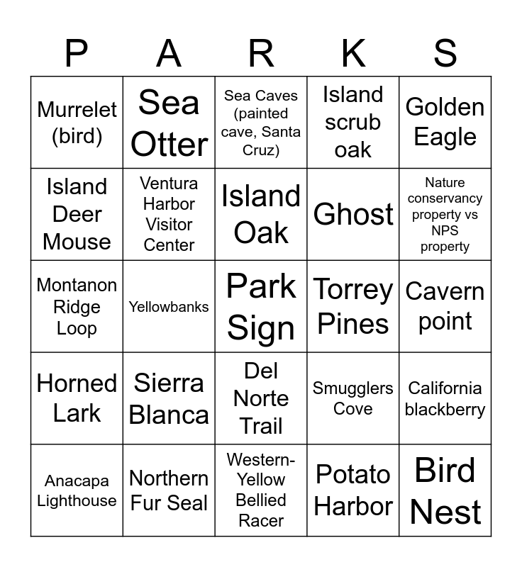 This bingo card has a free space and 76 words: Soft-leaved paintbrush, Allen’s Hummingbird, Sea Caves (painted cave, Santa Cruz), Cavern Point Loop, Scorpion Ranch House, Seals/Sea Lions, coast live oak, Island Fox, Arch Rock, Scorpion Canyon Loop, Vail and Vickers Cattle Ranch, Whale!, Island Oak, Island Deer Mouse, Scorpion Harbor, Yellowbanks, Scorpion Ranch House, Bird Nest, Coastal prickly pear, Golden Eagle, Starry night sky, Montanon Ridge Loop, Ventura Harbor Visitor Center, Sea Otter, Island scrub oak, Island Scrub-Jay, White sand beaches, Historic Ranch, Smuggler’s Cove, Kelp, Wildflowers, Brandt’s Cormorant, West point, Smugglers Cove, Nature conservancy property vs NPS property, Ghost, Channel islands poppy, Pelagic Cormorant, Cavern point, Potato Harbor, Prisoners harbor, Paleontological sites, Island malacothrix, Bald Eagle, Inspiration point, San Pedro Point, Anacapa Lighthouse, Murrelet (bird), Hoffmann’s slender-flowered gilia, Common Murre, Mount diablo, Del Norte Trail, fossils, Blue eyed grass, Side-blotched Lizard, Mount Pleasant, Willow’s Anchorage, California spiny lobster, Santa Cruz Island chicory, Baja california tree frog, Sierra Blanca, Shells!, Kelp, Dolphins, rainbow, Cattle-related artifacts, Torrey Pines, (rarest pine tree), Pigeon Guillemot, Shipwrecks, California blackberry, Horned Lark, Northern Fur Seal, Fragrant pitcher-sage, Western-Yellow Bellied Racer and Baby sea otters.