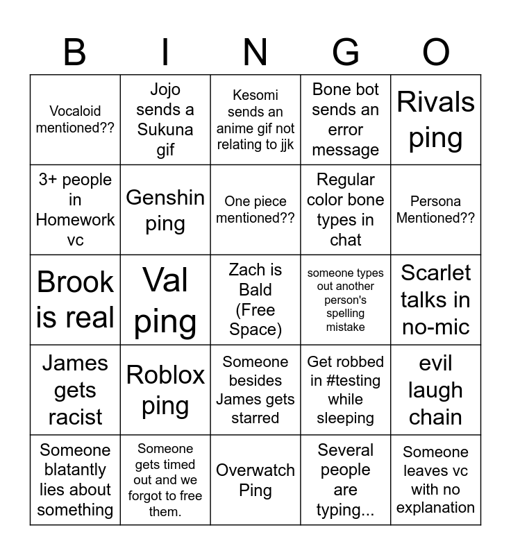 This bingo card has a free space and 24 words: Roblox ping, Someone gets timed out and we forgot to free them., One piece mentioned??, Someone blatantly lies about something, Rivals ping, Vocaloid mentioned??, 3+ people in Homework vc, Jojo sends a Sukuna gif, someone types out another person's spelling mistake, Someone besides James gets starred, Regular color bone types in chat, Brook is real, Get robbed in #testing while sleeping, evil laugh chain, Genshin ping, Several people are typing..., Scarlet talks in no-mic, Kesomi sends an anime gif not relating to jjk, Persona Mentioned??, Val ping, Someone leaves vc with no explanation, James gets racist, Bone bot sends an error message and Overwatch Ping.