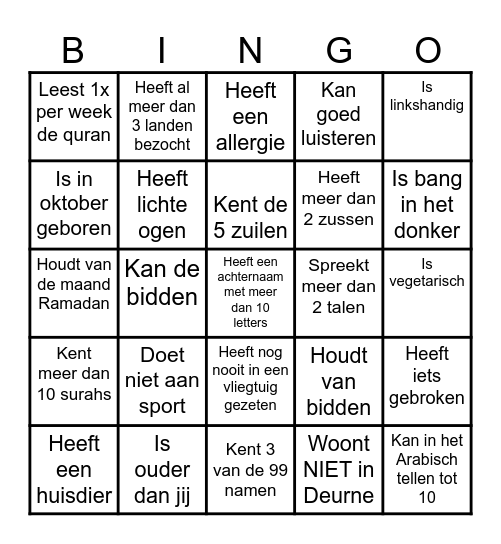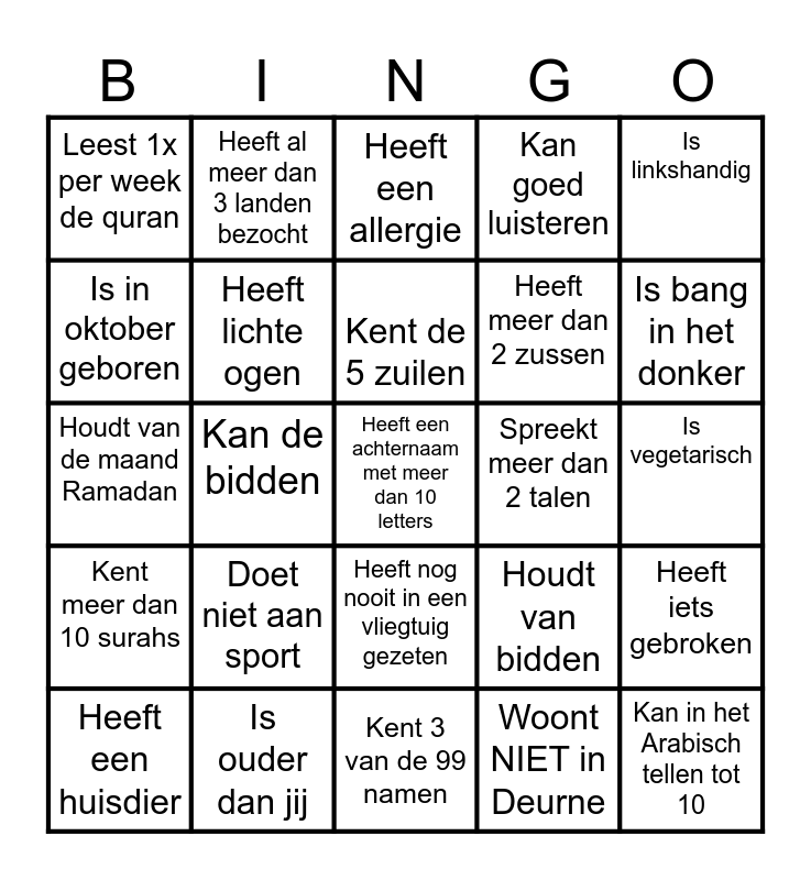 This bingo card has a free space and 24 words: Doet niet aan sport, Is ouder dan jij, Kent de 5 zuilen, Heeft een huisdier, Is linkshandig, Leest 1x per week de quran, Is in oktober geboren, Heeft al meer dan 3 landen bezocht, Spreekt meer dan 2 talen, Heeft nog nooit in een vliegtuig gezeten, Heeft meer dan 2 zussen, Houdt van de maand Ramadan, Houdt van bidden, Heeft iets gebroken, Heeft lichte ogen, Woont NIET in Deurne, Is vegetarisch, Heeft een allergie, Is bang in het donker, Kan de bidden, Kan in het Arabisch tellen tot 10, Kent meer dan 10 surahs, Kan goed luisteren and Kent 3 van de 99 namen.