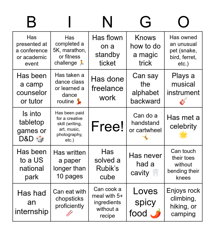 This bingo card has a free space and 74 words: Has been on a cruise π’, Has visited a historical landmark outside their home country, Has flown on a standby ticket, Has missed a flight βοΈ, Has lived in more than two different states or countries, Has been to a festival or concert in another country, Has ridden a train in another country, Has worked a retail or food service job, Has had an internship, Has worked a side hustle or gig work, Has worked the night shift π, Has had a job that required wearing a uniform, Has done freelance work, Has been a camp counselor or tutor, Has worked in customer service, Has been paid for a creative skill (writing, art, music, photography, etc.), Has done gig work (Uber, DoorDash, pet sitting, etc.), Plays a musical instrument πΈ, Enjoys crocheting, knitting, or sewing π§Ά, Is into tabletop games or D&D π², Has taken a dance class or learned a dance routine π, Has completed a 5K, marathon, or fitness challenge π, Knows how to do a magic trick, Has published a short story, poem, or song, Enjoys rock climbing, hiking, or camping, Has built a Lego set over 1,000 pieces, Has participated in a competitive eSports or gaming tournament, Has more than one pet, Has a cat π±, Has a dog πΆ, Has owned an unusual pet (snake, bird, ferret, etc.), Volunteered at an animal shelter, Is allergic to cats or dogs, Has rescued an injured animal, Has gone horseback riding π΄, Loves spicy food πΆοΈ, Has tried making homemade bread or pasta π, Drinks at least 2 cups of coffee a day β, Prefers tea over coffee π΅, Is a vegetarian or vegan π±, Can cook a meal with 5+ ingredients without a recipe, Can eat with chopsticks proficiently π₯’, Has eaten something unusual for the US (e.g., bugs, alligator, durian, etc.), Has changed their major at least once, Has pulled an all-nighter for an exam or paper, Has presented at a conference or academic event, Has worked in a campus lab, library, or student center, Has written a paper longer than 10 pages, Uses a planner or digital calendar religiously π , Has been in a group project where someone didnβt do their part, Uses a color-coded system for notes, Has accidentally slept through a class, Has met a celebrity π, Knows how to juggle π€Ή, Can whistle using their fingers, Has participated in a flash or dance mob, Has solved a Rubikβs cube, Has been on TV or the radio πΊπ», Has a tattoo or piercing (besides ears), Can touch their toes without bending their knees, Can say the alphabet backward, Has traveled alone to a new city, Has been to a US national park, Speaks more than one language fluently, Can do a handstand or cartwheel π€Έ, Has broken a bone π¦΄, Has never broken a bone π¦΄, Can name all 50 U.S. states from memory, Has never had a cavity π¦·, Can do an impression of a celebrity or cartoon character, Can hold their breath for over a minute, Can write with both hands (ambidextrous), Has visited at least 3 different countries and Has taken a road trip longer than 10 hours.