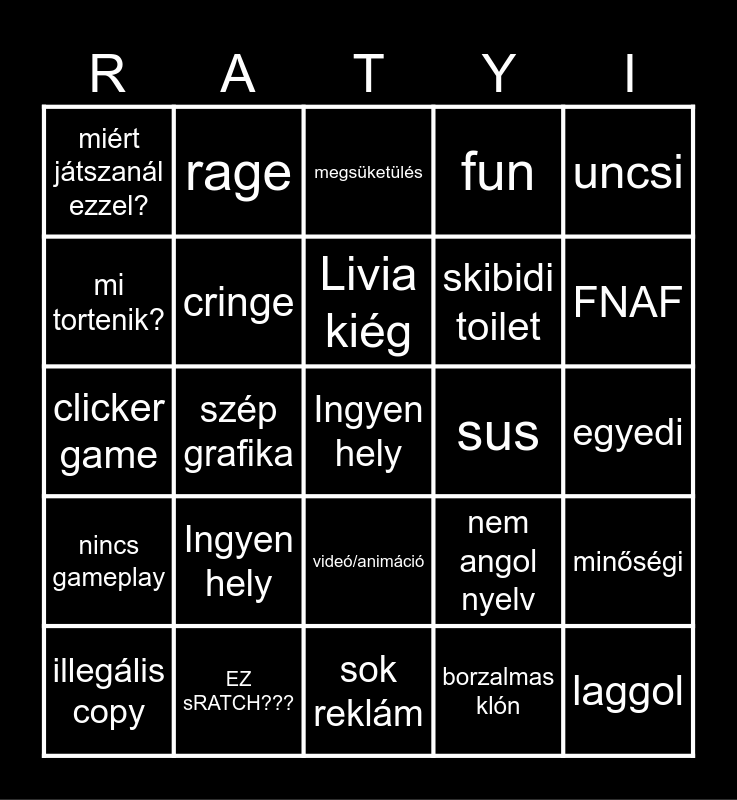 This bingo card has a free space and 24 words: Ingyen hely, EZ sRATCH???, Livia kiég, illegális copy, uncsi, miért játszanál ezzel?, mi tortenik?, rage, sus, videó/animáció, skibidi toilet, clicker game, nem angol nyelv, minőségi, cringe, borzalmas klón, egyedi, megsüketülés, FNAF, szép grafika, laggol, nincs gameplay, fun and sok reklám.