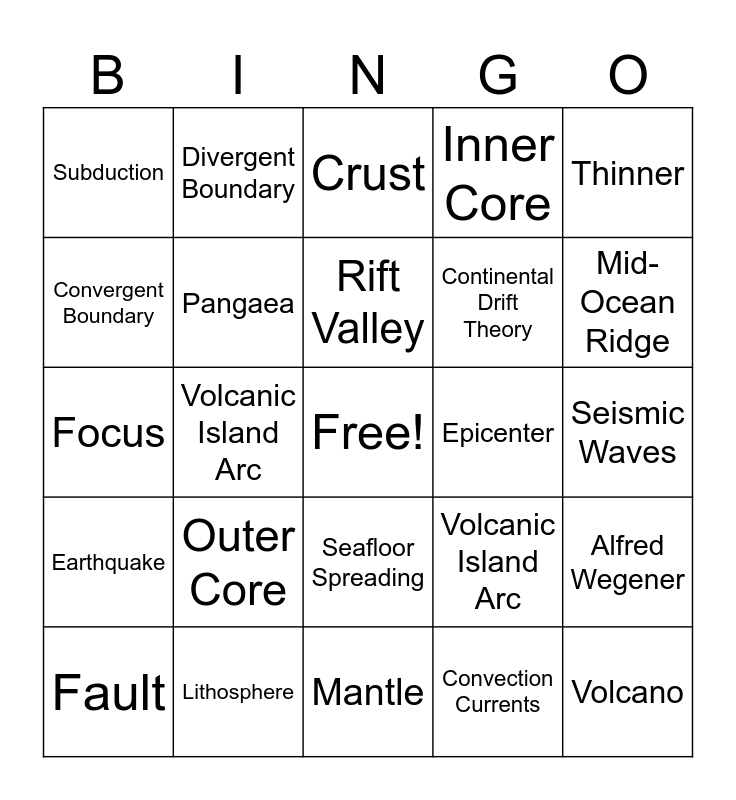 This bingo card has a free space and 28 words: Alfred Wegener, Asthenosphere, Continental Drift Theory, Convection Currents, Convergent Boundary, Crust, Divergent Boundary, Earthquake, Epicenter, Fault, Focus, Inner Core, Lithosphere, Mantle, Mid-Ocean Ridge, Mountains, Outer Core, Pangaea, Rift Valley, Seafloor Spreading, Subduction, Transform Boundary, Volcano, Volcanic Island Arc, Seismic Waves, Volcanic Island Arc, Thinner and Thicker.