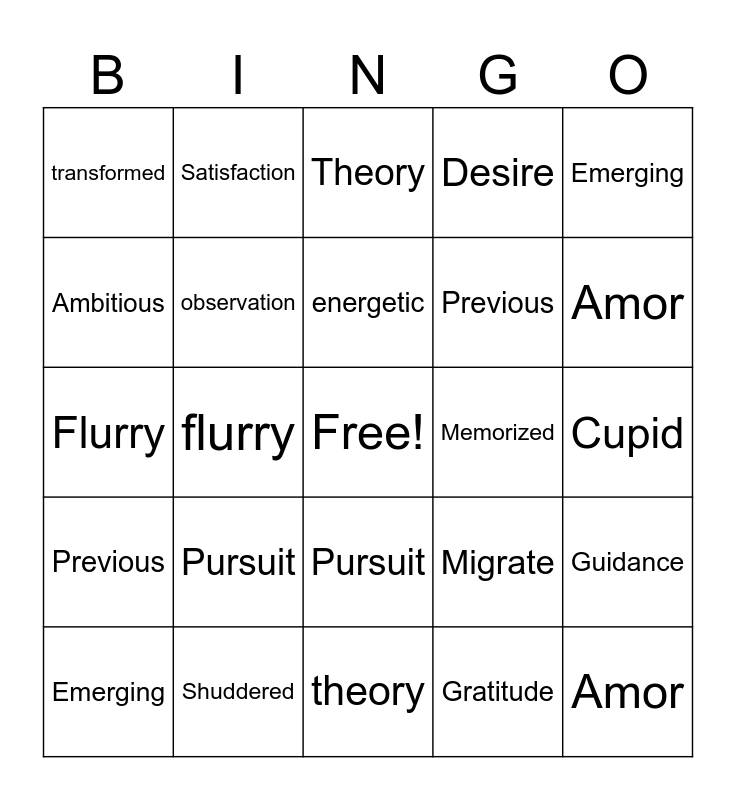 This bingo card has a free space and 50 words: Detected, Amor, Outcome, theory, Pursuit, Behaviors, Satisfaction, Valentine, Ambitious, Shuddered, observation, Desire, Guidance, Migrate, Cupid, Assuring, energetic, Memorized, Passion, Emerging, flurry, Gratitude, transformed, Previous, Disappearance, Detected, Amor, Outcome, Theory, Pursuit, Behaviors, Satisfaction, Valentine, Ambitious, Shuddered, observation, Desire, Guidance, Migrate, Cupid, Assuring, energetic, Memorized, Passion, Emerging, Flurry, Gratitude, Transformed, Previous and Disappearance.