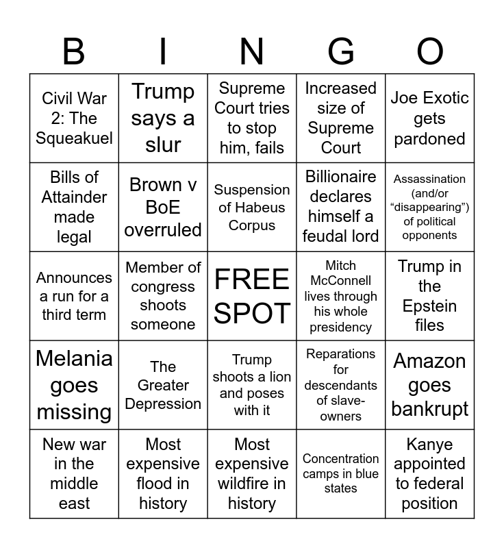 This bingo card has a free space and 74 words: Invasion of Cuba, Criticism of the president is illegal, Supreme Court tries to stop him, fails, Senate Republicans try to stop him, fail, House Republicans try to stop him, fail, Democratic politician arrested on spurious grounds, Trump and Elon falling out, Trump family member scapegoat, New war in the middle east, New invasion by Russia, Dismantling NATO, War with Mexico, Suspension of Habeus Corpus, Bills of Attainder made legal, Mandatory guns for teachers, Member of congress shoots someone, Trump personally kills someone, Assassination (and/or “disappearing”) of political opponents, Congress votes to cripple itself, Announces a run for a third term, Brown v BoE overruled, Trump says a slur, Increased size of Supreme Court, Israel invades Egypt with US support, Kanye appointed to federal position, Trump robs the treasury, Impeached again, Greenland renamed “Red, White, and Blueland”, Trump names a state after himself, January 6th declared a holiday, Joe Exotic gets pardoned, Canada invades the US, Retroactively declares himself winner of 2020 election, Trump flees the country, Jack Smith arrested, Concentration camps in blue states, Putin/Trump phone call(s) leaked, US colonial state in Africa or Southeast Asia, Nuclear War, Most expensive hurricane in history, Most expensive wildfire in history, Most expensive flood in history, Deadliest industrial accident in (American) History, New type of racism, Mass book burnings, Civil War 2: The Squeakuel, Famine in USA, The Greater Depression, Nazi flag on stage with Trump, Plastic bags return, Worst oil spill in history, Someone famous dies in a cybertruck malfunction, Trump in the Epstein files, Diddy gets pardoned, Andrew Tate becomes Secretary of State, Whale hunting resumes, Trump shoots a lion and poses with it, Dolphins go extinct, More than half the Amazon destroyed, Amazon goes bankrupt, Billionaire declares himself a feudal lord, Trump openly commits statutory rape, Melania goes missing, Trump has an affair with a man, Mitch McConnell lives through his whole presidency, Biden wins in 2028, Trump declares himself divine, SBC calls for reinstitution of slavery, Reparations for descendants of slave-owners, Televangelist prays to Trump, Official church of America, Q-Anon declared official history, $10 a gallon for gas and $20 eggs.