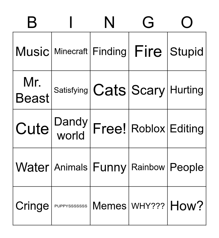 This bingo card has a free space and 24 words: Animals, PUPPYSSSSSSS, Cats, Cringe, Stupid, Music, Mr. Beast, Minecraft, Roblox, Funny, Scary, Cute, Rainbow, People, Satisfying, WHY???, Editing, Finding, Hurting, Dandy world, How?, Water, Fire and Memes.