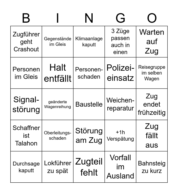 This bingo card has 25 words: Oberleitungs- schaden, Zugteil fehlt, Personen- schaden, Durchsage kaputt, Warten auf Zug, Zugführer geht Crashout, Personen im Gleis, Gegenstände im Gleis, Weichen- reparatur, Störung am Zug, Polizei- einsatz, Signal- störung, +1h Verspätung, Zug fällt aus, Halt entfällt, Bahnsteig zu kurz, Zug endet frühzeitig, Klimaanlage kaputt, Reisegruppe im selben Wagen, geänderte Wagenreihung, Baustelle, Lokführer zu spät, Schaffner ist Talahon, 3 Züge passen auch in einen and Vorfall im Ausland.
