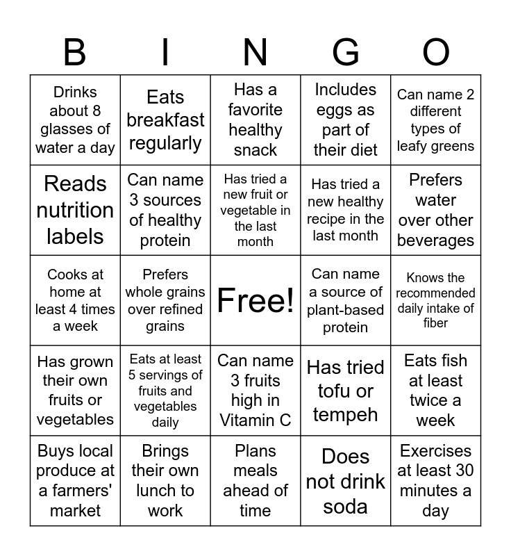 This bingo card has a free space and 24 words: Eats at least 5 servings of fruits and vegetables daily, Brings their own lunch to work, Has tried a new fruit or vegetable in the last month, Buys local produce at a farmers' market, Can name 2 different types of leafy greens, Drinks about 8 glasses of water a day, Reads nutrition labels, Eats breakfast regularly, Can name a source of plant-based protein, Can name 3 fruits high in Vitamin C, Has tried a new healthy recipe in the last month, Cooks at home at least 4 times a week, Has tried tofu or tempeh, Eats fish at least twice a week, Can name 3 sources of healthy protein, Does not drink soda, Knows the recommended daily intake of fiber, Has a favorite healthy snack, Prefers water over other beverages, Prefers whole grains over refined grains, Exercises at least 30 minutes a day, Has grown their own fruits or vegetables, Includes eggs as part of their diet and Plans meals ahead of time.