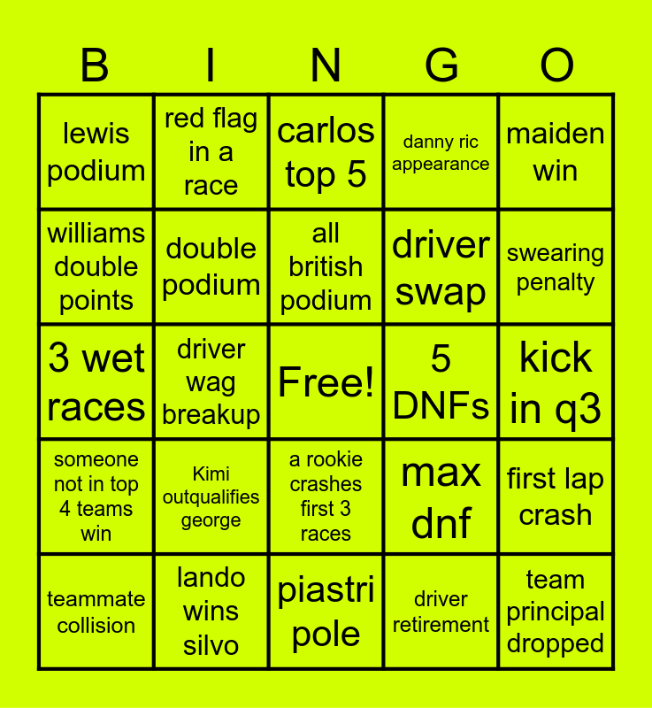 This bingo card has a free space and 24 words: Kimi outqualifies george, lando wins silvo, all british podium, teammate collision, maiden win, lewis podium, williams double points, red flag in a race, 5 DNFs, a rookie crashes first 3 races, driver swap, 3 wet races, max dnf, first lap crash, double podium, driver retirement, kick in q3, carlos top 5, swearing penalty, driver wag breakup, team principal dropped, someone not in top 4 teams win, danny ric appearance and piastri pole.