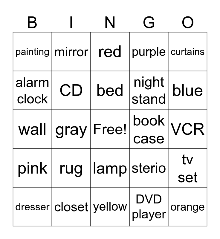 This bingo card has a free space and 24 words: rug, closet, bed, dresser, curtains, painting, alarm clock, mirror, book case, lamp, night stand, wall, sterio, tv set, CD, DVD player, VCR, red, blue, gray, orange, pink, purple and yellow.