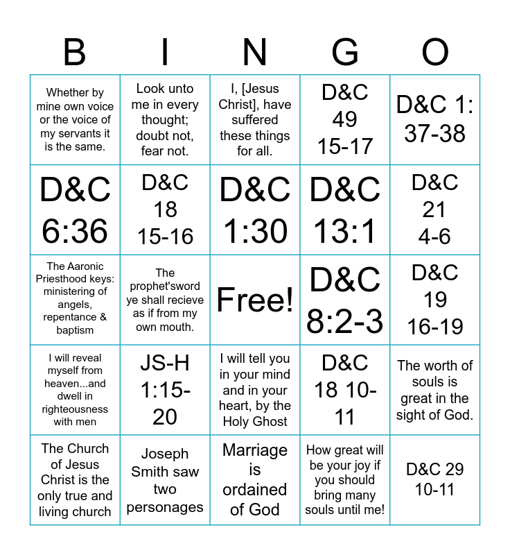 This bingo card has a free space and 24 words: JS-H 1:15-20, Joseph Smith saw two personages, D&C 1:30, The Church of Jesus Christ is the only true and living church, D&C 1: 37-38, Whether by mine own voice or the voice of my servants it is the same., D&C 6:36, Look unto me in every thought; doubt not, fear not., D&C 8:2-3, I will tell you in your mind and in your heart, by the Holy Ghost, D&C 13:1, The Aaronic Priesthood keys: ministering of angels, repentance & baptism, D&C 18 10-11, The worth of souls is great in the sight of God., D&C 18 15-16, How great will be your joy if you should bring many souls until me!, D&C 19 16-19, I, [Jesus Christ], have suffered these things for all., D&C 21 4-6, The prophet'sword ye shall recieve as if from my own mouth., D&C 29 10-11, I will reveal myself from heaven...and dwell in righteousness with men, D&C 49 15-17 and Marriage is ordained of God.