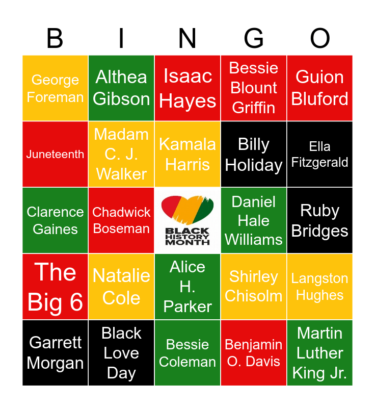 This bingo card has a free space and 26 words: Don Cheadle, Natalie Cole, Bessie Coleman, Benjamin O. Davis, Ella Fitzgerald, George Foreman, Althea Gibson, Isaac Hayes, Billy Holiday, Langston Hughes, Clarence Gaines, Chadwick Boseman, Shirley Chisolm, Martin Luther King Jr., The Big 6, Frederick Douglas, Kamala Harris, Daniel Hale Williams, Guion Bluford, Garrett Morgan, Madam C. J. Walker, Alice H. Parker, Bessie Blount Griffin, Ruby Bridges, Juneteenth and Black Love Day.
