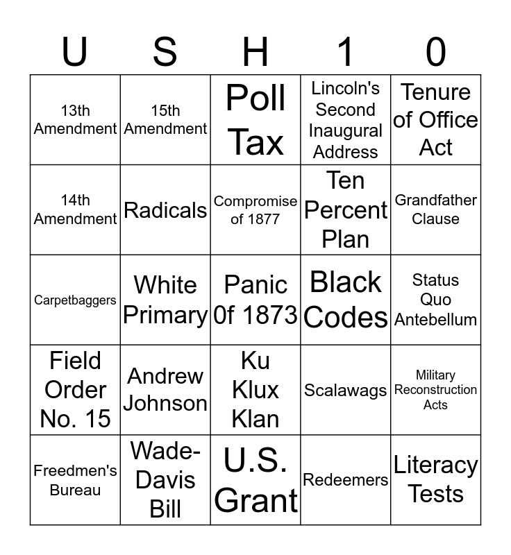 This bingo card has 25 words: Andrew Johnson, U.S. Grant, Compromise of 1877, Freedmen's Bureau, Tenure of Office Act, 13th Amendment, 14th Amendment, 15th Amendment, Black Codes, Ku Klux Klan, Ten Percent Plan, Carpetbaggers, Scalawags, Military Reconstruction Acts, Radicals, Literacy Tests, Status Quo Antebellum, Poll Tax, Grandfather Clause, White Primary, Panic 0f 1873, Wade-Davis Bill, Field Order No. 15, Lincoln's Second Inaugural Address and Redeemers.