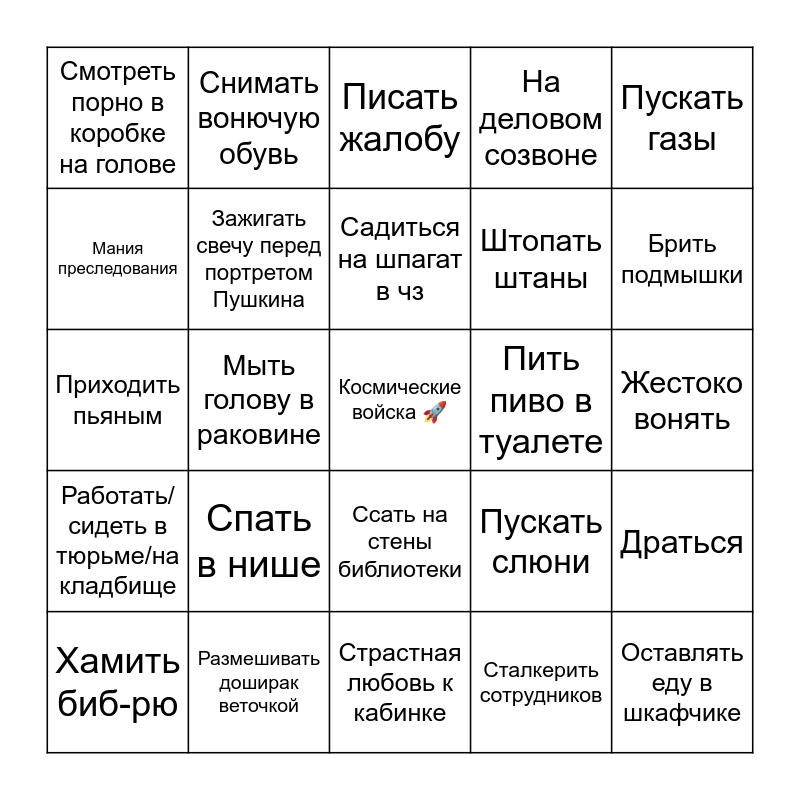 This bingo card has a free space and 24 words: Спать в нише, Размешивать доширак веточкой, Садиться на шпагат в чз, Хамить биб-рю, Пускать газы, Смотреть порно в коробке на голове, Мания преследования, Снимать вонючую обувь, Пить пиво в туалете, Ссать на стены библиотеки, Штопать штаны, Приходить пьяным, Пускать слюни, Драться, Зажигать свечу перед портретом Пушкина, Сталкерить сотрудников, Жестоко вонять, Писать жалобу, Брить подмышки, Мыть голову в раковине, Оставлять еду в шкафчике, Работать/сидеть в тюрьме/на кладбище, На деловом созвоне and Страстная любовь к кабинке.