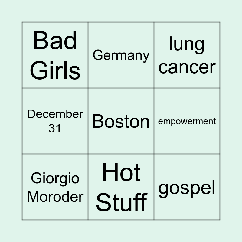 This bingo card has 13 words: 5, Adrian, Giorgio Moroder, Germany, December 31, Boston, gospel, 1979, Hot Stuff, Bad Girls, empowerment, lung cancer and Queen of Disco.