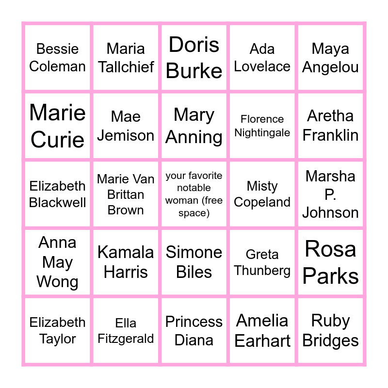 This bingo card has a free space and 48 words: Clara Barton, Ruby Bridges, Sally Ride, Princess Diana, Kamala Harris, Elizabeth Fry, Maria Tallchief, Malala Yousafzai, Marie Curie, Rosalind Franklin, Mae Jemison, Ada Lovelace, Rosa Parks, Greta Thunberg, Frida Kahlo, Tammy Baldwin, Mary Anning, Misty Copeland, Nellie Bly, Maya Angelou, Marie Van Brittan Brown, Amelia Earhart, Bessie Coleman, Florence Nightingale, Sandra Day O'Connor, Aretha Franklin, Elizabeth Taylor, Serena Williams, Simone Biles, Anna May Wong, Susan B. Anthony, Sojourner Truth, Eleanor Roosevelt, Hedy Lamarr, Ella Fitzgerald, Rita Moreno, Angela Davis, Marsha P. Johnson, Gloria Steinem, Michelle Kwan, Maria Beasley, Kathrine Virginia Switzer, Doris Burke, Jeannette Rankin, Elizabeth Blackwell, Laura Bassi, Ida B. Wells and Arabella Mansfield.