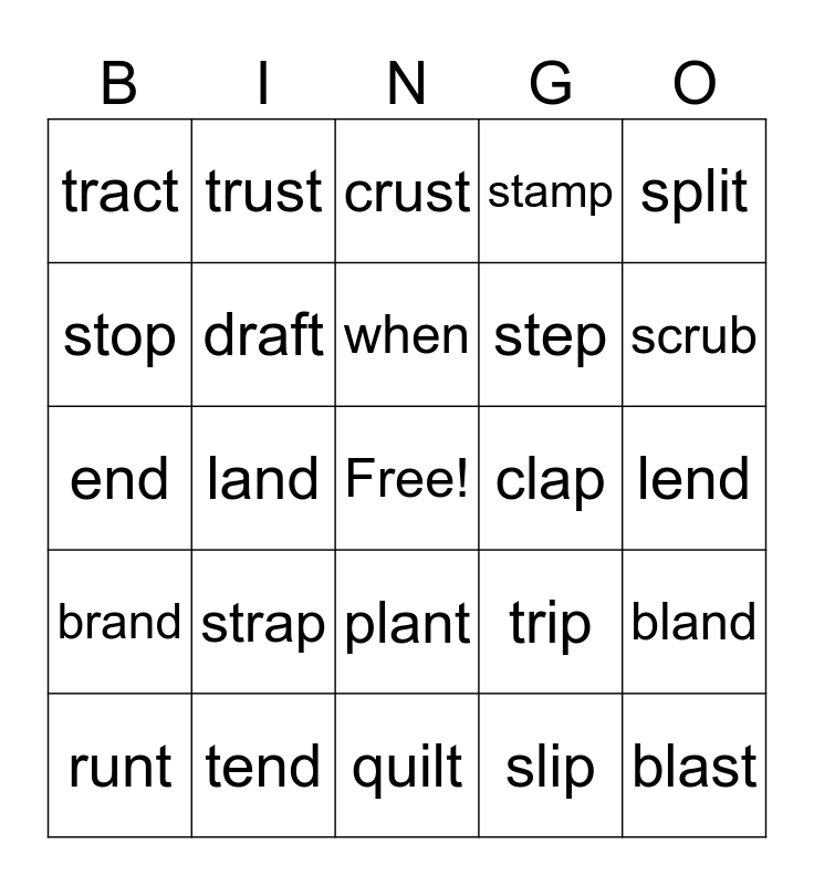 This bingo card has a free space and 31 words: quilt, grand, land, strip, tract, crust, draft, trip, clap, slip, lend, blast, quit, scram, scrub, stand, bland, strap, brand, plant, split, squid, runt, trust, step, stop, stamp, end, tend, when and went.