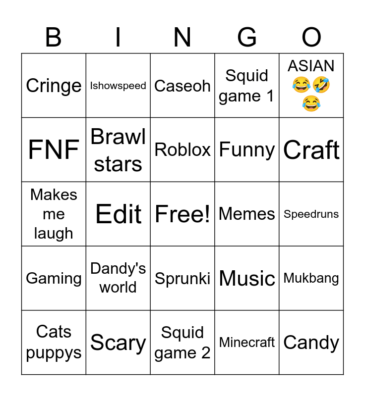 This bingo card has a free space and 24 words: Cats puppys, Dandy's world, Roblox, Minecraft, ASIAN😂🤣😂, Cringe, Ishowspeed, Caseoh, Memes, Speedruns, Makes me laugh, Brawl stars, Music, Mukbang, FNF, Scary, Squid game 2, Squid game 1, Craft, Gaming, Edit, Sprunki, Funny and Candy.