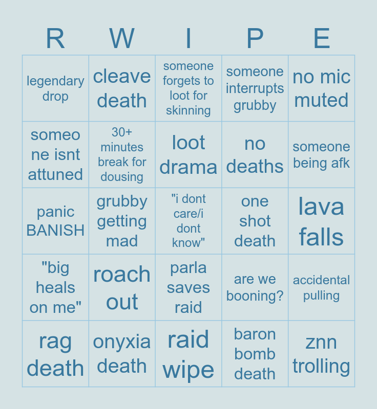 This bingo card has a free space and 24 words: roach out, onyxia death, loot drama, rag death, no mic muted, legendary drop, someo ne isnt attuned, cleave death, one shot death, parla saves raid, no deaths, panic BANISH, are we booning?, accidental pulling, 30+ minutes break for dousing, baron bomb death, lava falls, someone forgets to loot for skinning, someone being afk, grubby getting mad, znn trolling, "big heals on me", someone interrupts grubby and raid wipe.