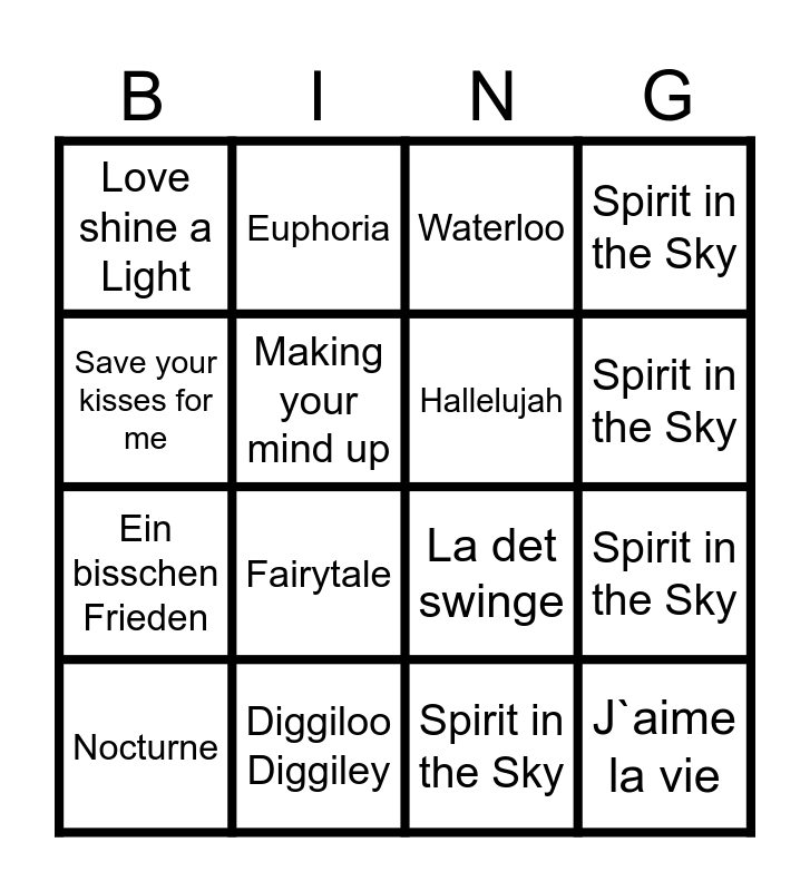 This bingo card has 20 words: Spirit in the Sky, Hold me now, Waterloo, Ding-A-Dong, Nocturne, Save your kisses for me, Diggiloo Diggiley, Love shine a Light, Ein bisschen Frieden, Euphoria, Fairytale, La det swinge, Making your mind up, J`aime la vie, Hallelujah, Fångad av en stormvind, Spirit in the Sky, Spirit in the Sky, Spirit in the Sky and Spirit in the Sky.