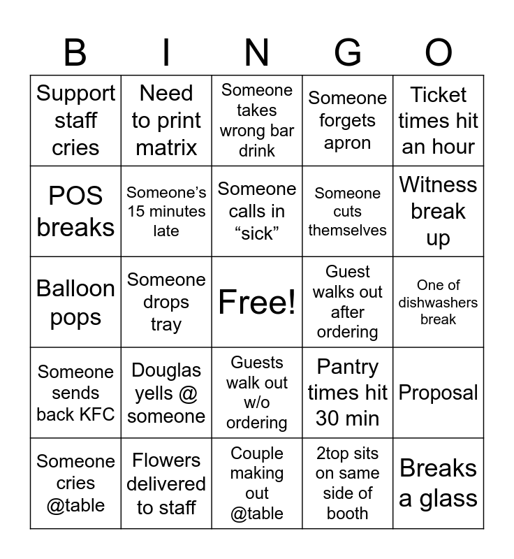 This bingo card has a free space and 37 words: DoorDasher yells @ Takeout, Employee walks out on shift, Someone gets fired, Someone’s 15 minutes late, Proposal, Douglas yells @ someone, Someone calls in “sick”, Ticket time hits 40 min, Ticket times hit an hour, Ticket times hit 50 min, Someone drops tray, Someone forgets apron, Breaks a glass, One of dishwashers break, POS breaks, Someone sends back KFC, Someone breaks plate, Someone takes wrong bar drink, Guests walk out w/o ordering, Guest walks out after ordering, Support staff cries, Witness break up, Someone cries @table, Couple making out @table, Couple feeding each other, 2top sits on same side of booth, Need to print matrix, “Allergic to onions”, Someone says they’ll never come back, Bad Google review, “You ruined my Valentines”, Flowers delivered to staff, Balloon pops, All managers in office @once, Pantry times hit 30 min, Someone cuts themselves and Someone burns themselves.