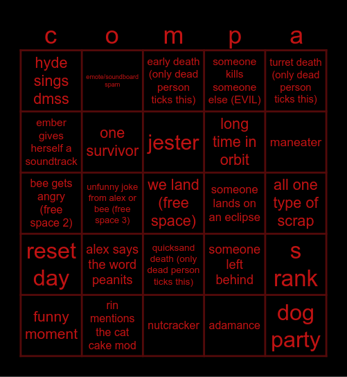 This bingo card has a free space and 24 words: alex says the word peanits, rin mentions the cat cake mod, jester, funny moment, turret death (only dead person ticks this), hyde sings dmss, ember gives herself a soundtrack, emote/soundboard spam, someone lands on an eclipse, quicksand death (only dead person ticks this), long time in orbit, bee gets angry (free space 2), someone left behind, s rank, one survivor, adamance, all one type of scrap, early death (only dead person ticks this), maneater, unfunny joke from alex or bee (free space 3), dog party, reset day, someone kills someone else (EVIL) and nutcracker.