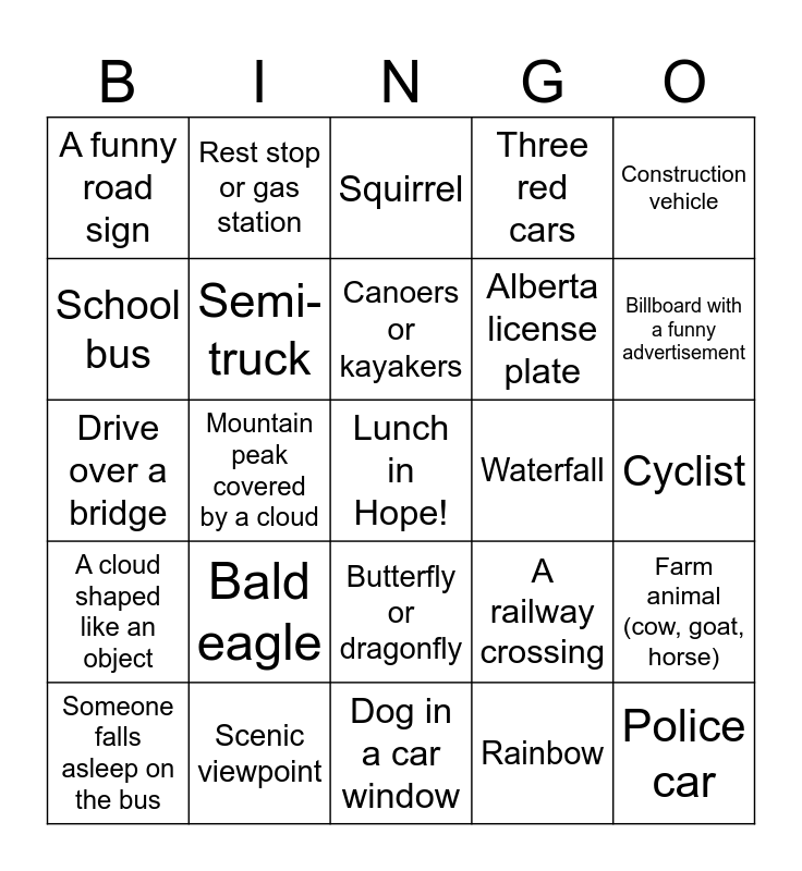 This bingo card has a free space and 24 words: Bald eagle, Scenic viewpoint, Canoers or kayakers, Someone falls asleep on the bus, Construction vehicle, A funny road sign, School bus, Rest stop or gas station, Waterfall, Butterfly or dragonfly, Alberta license plate, Drive over a bridge, A railway crossing, Farm animal (cow, goat, horse), Semi-truck, Rainbow, Cyclist, Squirrel, Billboard with a funny advertisement, Mountain peak covered by a cloud, Police car, A cloud shaped like an object, Three red cars and Dog in a car window.