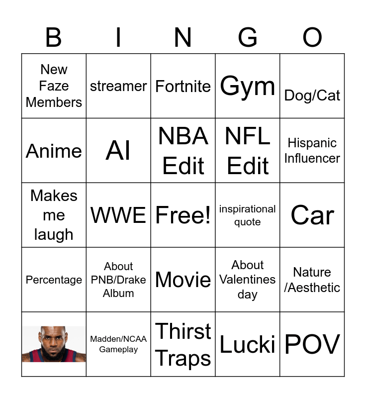 This bingo card has 1 images, a free space and 23 words: About PNB/Drake Album, NBA Edit, Lucki, Dog/Cat, New Faze Members, streamer, Fortnite, inspirational quote, Car, Makes me laugh, AI, About Valentines day, Nature /Aesthetic, Anime, Madden/NCAA Gameplay, Thirst Traps, Gym, Hispanic Influencer, Percentage, WWE, Movie, NFL Edit and POV.