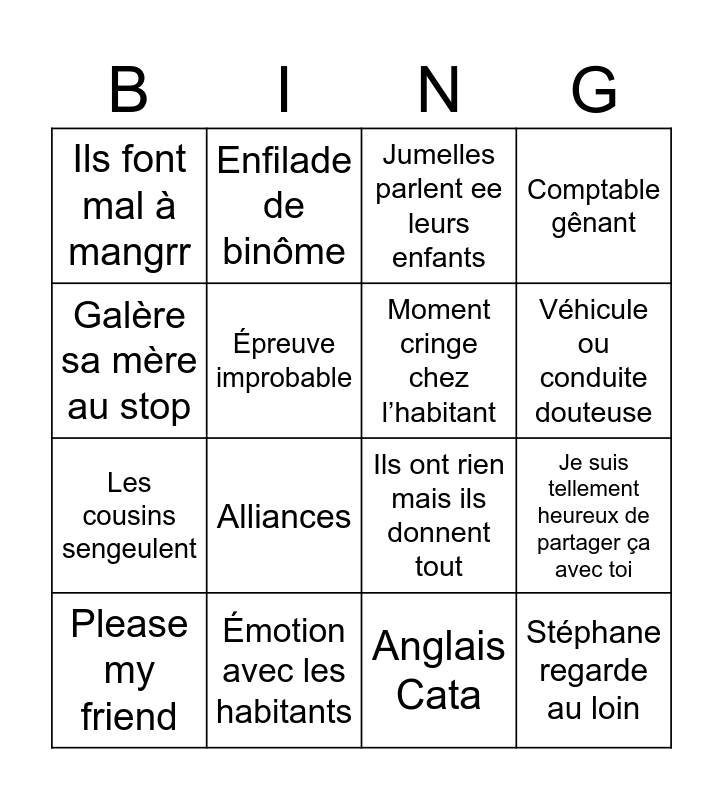 This bingo card has 16 words: Please my friend, Émotion avec les habitants, Jumelles parlent ee leurs enfants, Comptable gênant, Galère sa mère au stop, Enfilade de binôme, Ils ont rien mais ils donnent tout, Je suis tellement heureux de partager ça avec toi, Ils font mal à mangrr, Épreuve improbable, Anglais Cata, Véhicule ou conduite douteuse, Les cousins sengeulent, Alliances, Moment cringe chez l’habitant and Stéphane regarde au loin.