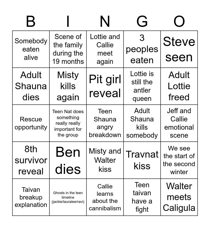 This bingo card has 25 words: Ben dies, Callie learns about the cannibalism, Pit girl reveal, Taivan breakup explanation, Steve seen, Somebody eaten alive, Adult Shauna dies, Scene of the family during the 19 months, Adult Shauna kills somebody, Misty and Walter kiss, Lottie is still the antler queen, Rescue opportunity, Travnat kiss, We see the start of the second winter, Misty kills again, Walter meets Caligula, Jeff and Callie emotional scene, Lottie and Callie meet again, Adult Lottie freed, Teen Nat does something really really important for the group, Teen Shauna angry breakdown, Ghosts in the teen timeline (jackie/lauralee/ravi), 8th survivor reveal, 3 peoples eaten and Teen taivan have a fight.