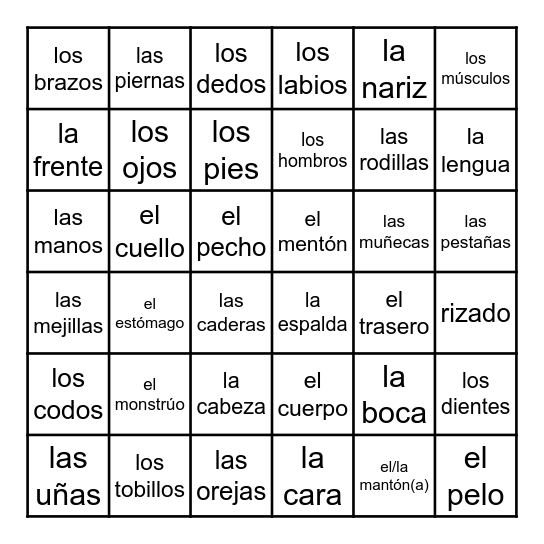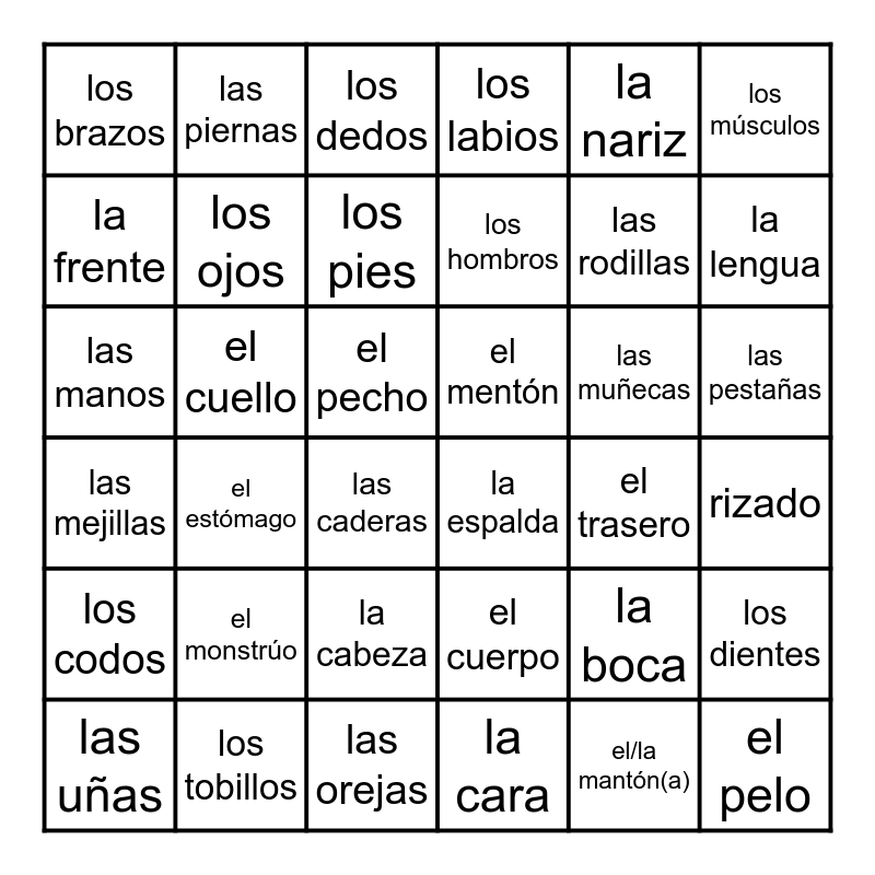 This bingo card has 36 words: el cuerpo, la cabeza, la cara, la frente, las mejillas, el mentón, los ojos, las orejas, la nariz, la boca, la lengua, los labios, los dientes, el cuello, los hombros, los brazos, los codos, las muñecas, las manos, los dedos, el pecho, el estómago, la espalda, las caderas, el trasero, las piernas, las rodillas, los tobillos, los pies, los músculos, el pelo, las uñas, rizado, las pestañas, el monstrúo and el/la mantón(a).