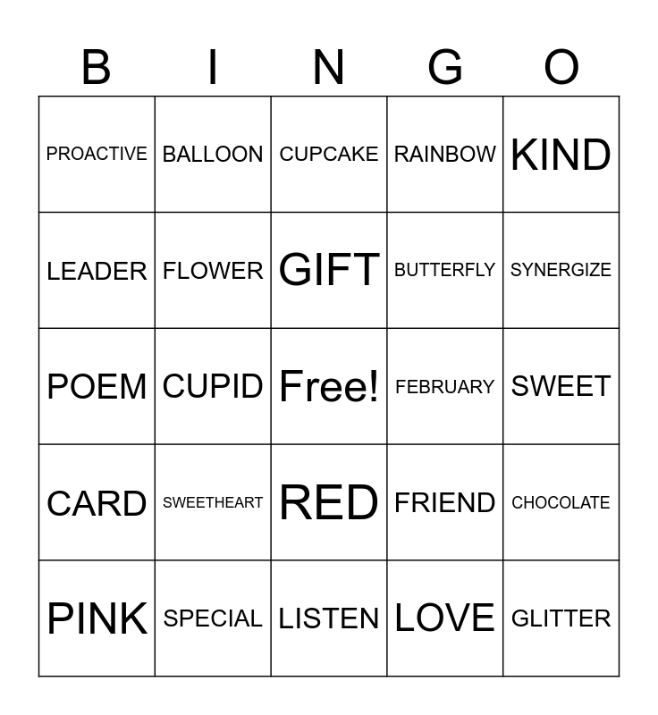 This bingo card has a free space and 32 words: LOVE, HEART, CUPID, CANDY, CARD, FLOWER, KIND, CHOCOLATE, BALLOON, VALENTINE, GIFT, CUPCAKE, RING, COOKIE, FEBRUARY, HUG, PINK, POEM, RED, SWEETHEART, FRIEND, ROSE, SWEET, SPECIAL, GLITTER, RAINBOW, BUTTERFLY, LEADER, PROACTIVE, LISTEN, WIN-WIN and SYNERGIZE.